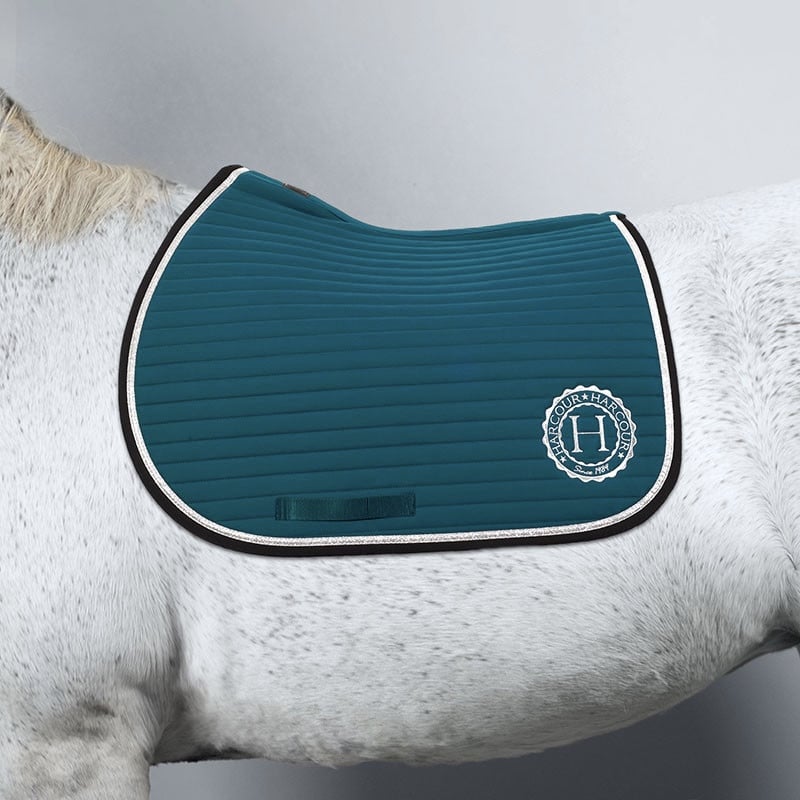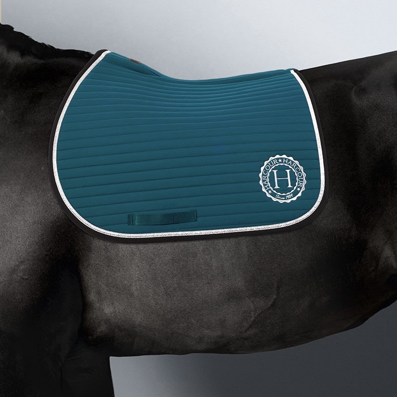 The Harcour Karembar Jump Saddle Pad: Petrol is an embossed cotton saddle pad offering better absorption and optimum breathability. The quilting panels adapts to all types of horses and the elegant styling means the pad can be used for everyday riding or competitions. The design of the Karembar saddle pad offers a solid cut and shape meaning it remains well in place under saddle.