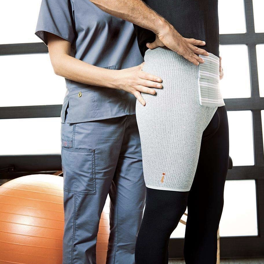 The Incrediwear Hip Brace: Grey eases discomfort and aids recovery for hip and thigh related injuries or conditions. Available either for the left and right hip, the Hip Brace can be worn during or after activity without restricting mobility.