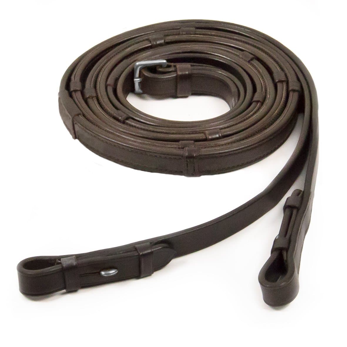 The Schockemohle Half Rubber Lined Snaffle Rein: Dark Brown/Silver are a pair of snaffle reins to be used with either a snaffle bridle or double bridle with the curb rein. These rubber lined reins benefits from the grip of the rubber lining on the inside of the rein along with added grip from the leather stoppers every few inches down the rein. These reins come in flat leather with hook and stud fastening’s on the bit end of the rein.