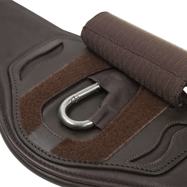The Portland long girth is made of grained soft leather and has a large carabiner in the middle, which makes it easier to buckle in the breastplate. For even more security, the carabiner can be covered with the large leather flap. Two side D-rings offer even more options for buckling auxiliary reins. Available in black/silver and brown/silver, the girth comes with tripple-fold elastic on both sides and solid roller buckles with soft padding.