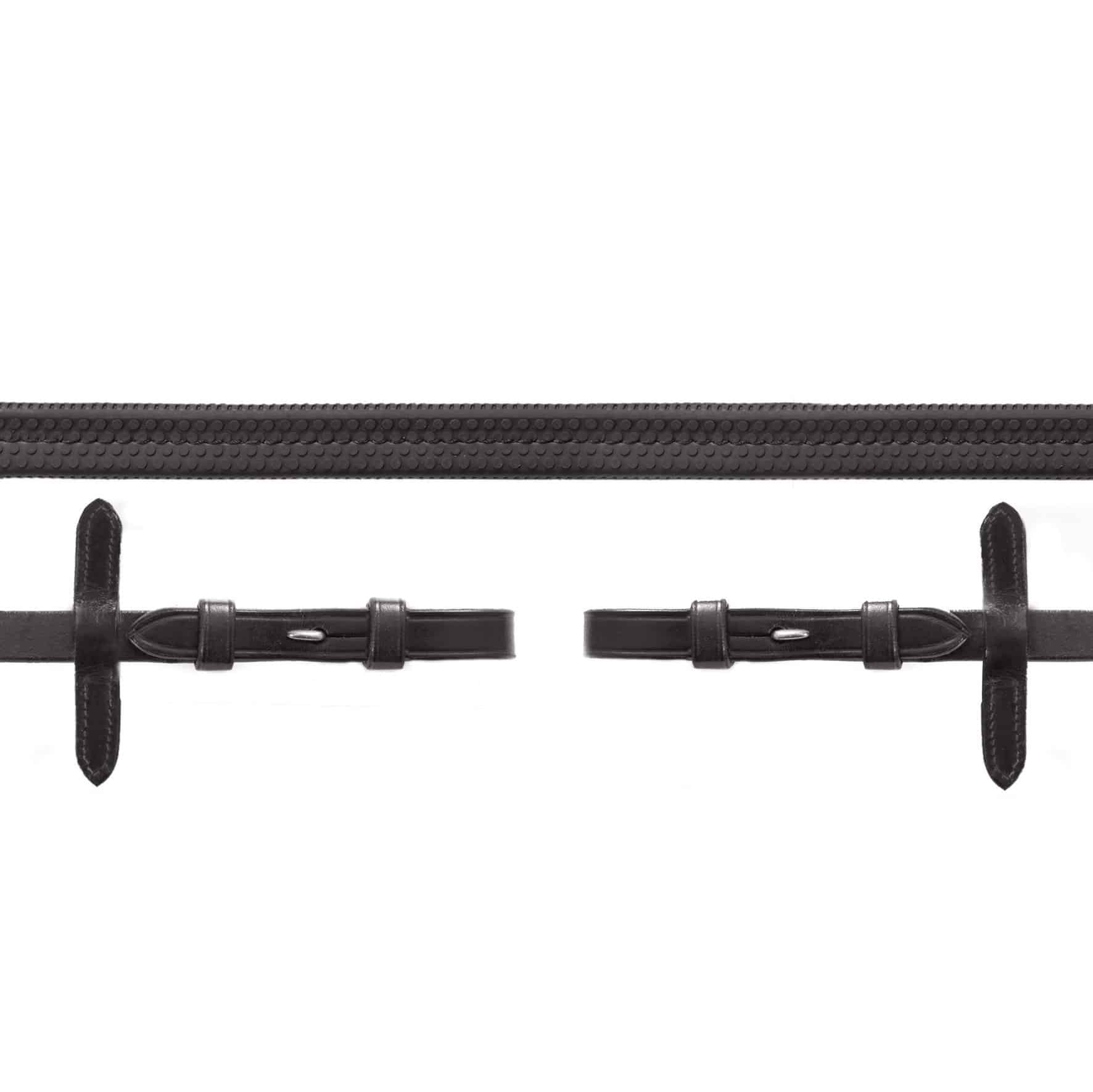 The Schockemohle Rubber Reins With Hook & Stud Fastening: Black/Silver are a pair of rubber reins in black flat leather with silver fixings and hook & stud style fastening to attach to the bit. Also available in brown.