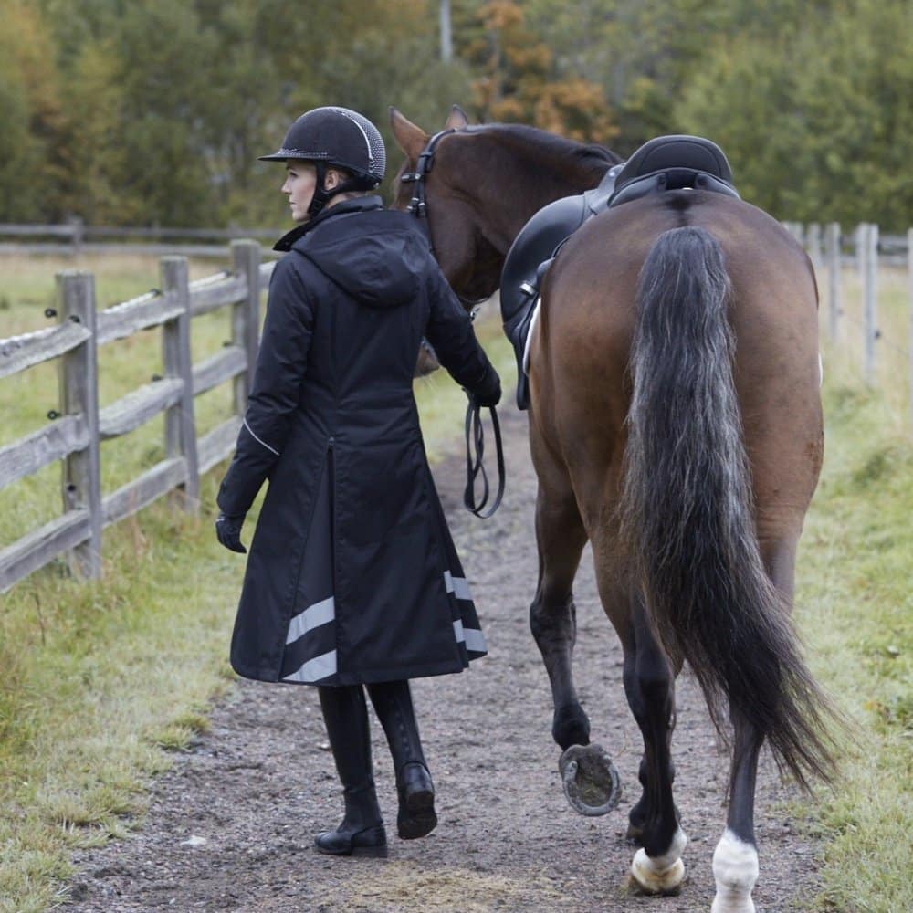 The Stierna Stella Winter Long Coat: Black is a must have this winter – The Stella Winter coat by Stierna. It protects you against snow, rain and wind while releases excess heat and moisture from the body and the layers underneath. A water and windproof yet breathable garment with all seams tape-sealed and with a lightweight down-free padding that will keep you comfortable even during the coldest day. It is your shield against the elements and no matter the conditions you and your horse can still perform at your very best.