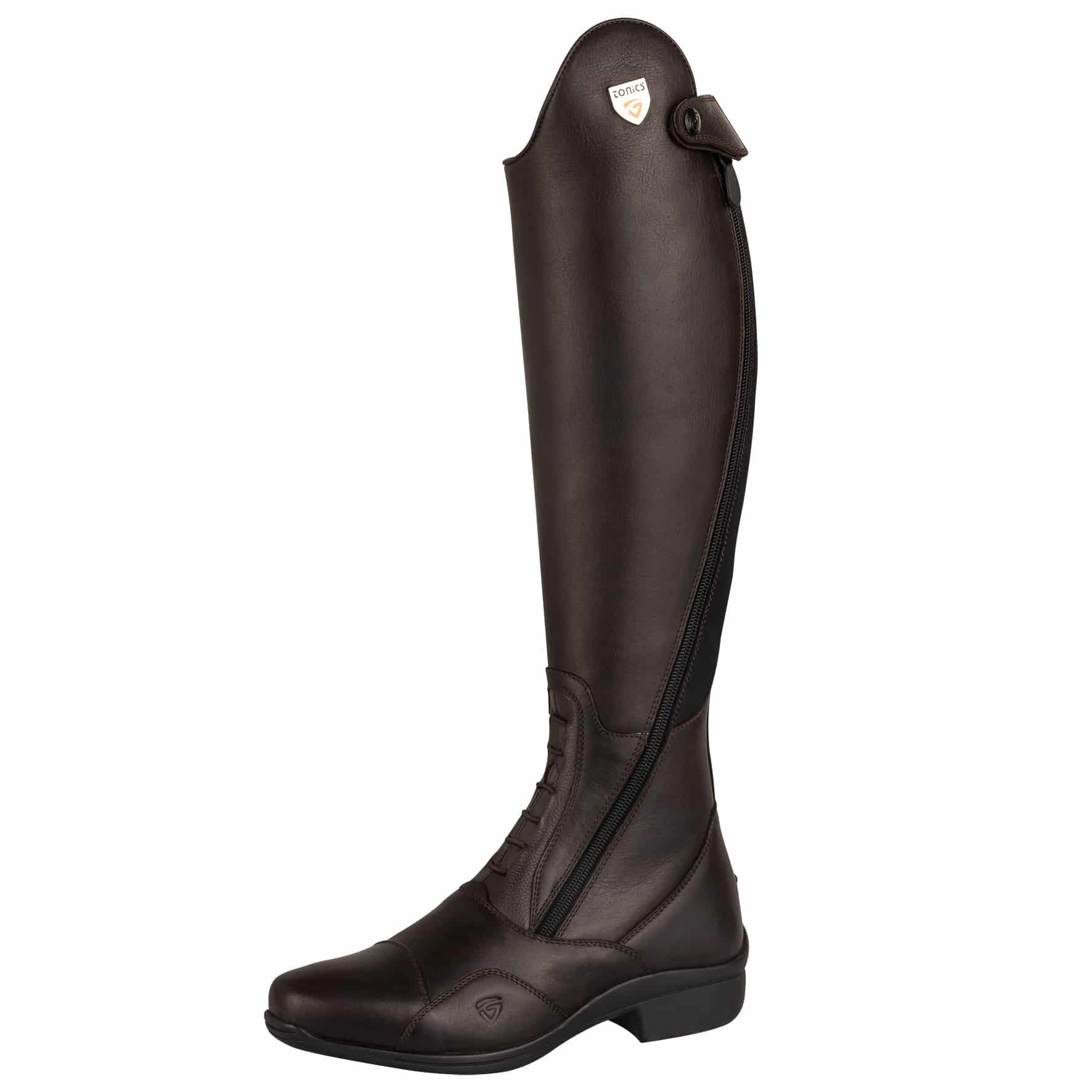 The Tonics Jupiter Tall Riding Boots: Dark brown are a pair of long riding boots that are equipped with the “Silver Label” sole technology and fulfll all requirements for a comfortable and functional riding boots. The preshaped insole and high-quality outsole provide the riders‘ foot with optimal hold on the ground and in the stirrup. The high-quality smooth leather gives “Jupiter” a sportive and elegant look, which is supported by the modern shape of the bootleg’s upper arch.